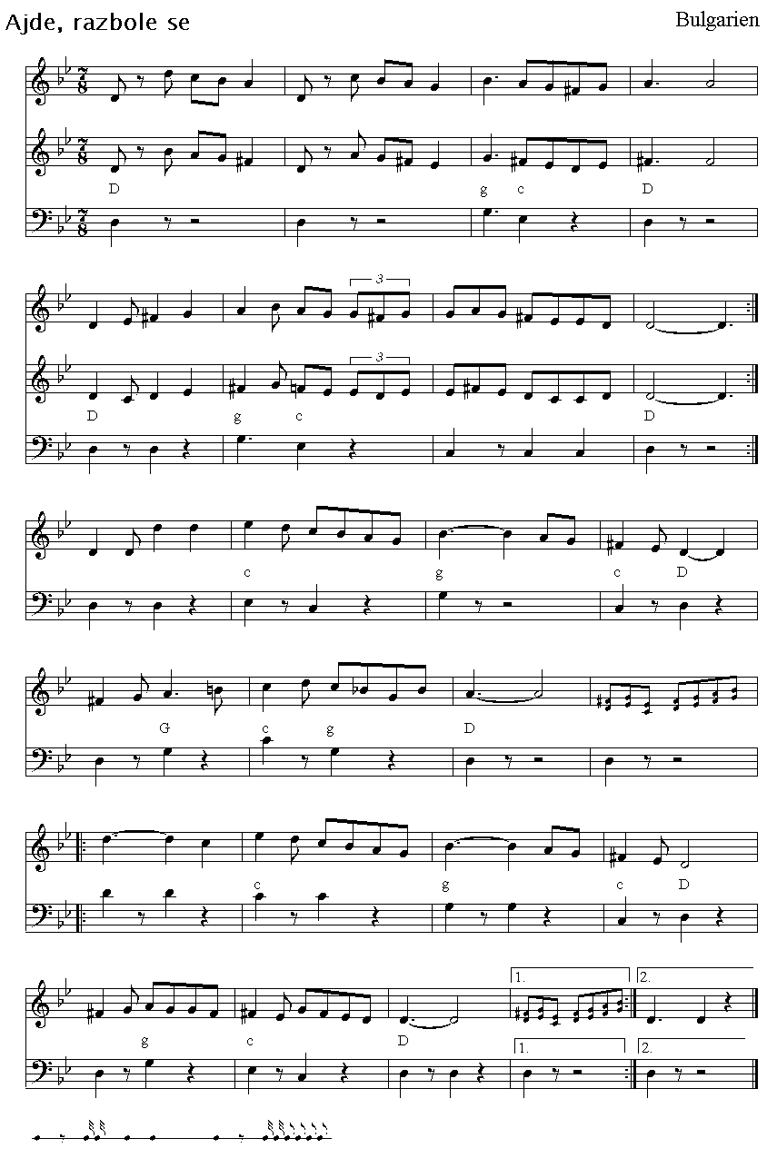 《Ajde, razbole se》是为小提琴和吉他整理的乐谱。此乐谱来自保加利亚。此曲为传统音乐。