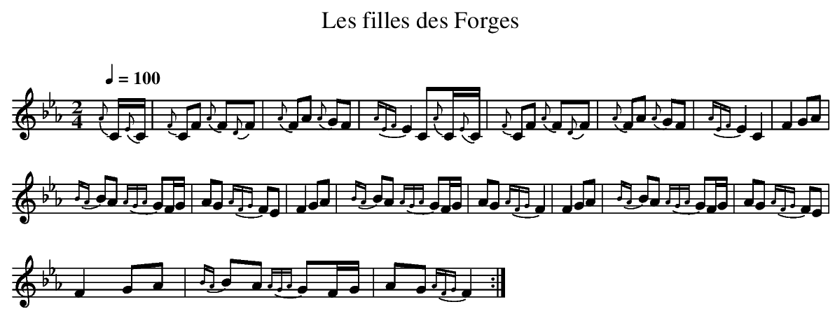 《Les Filles des forges》是为苏格兰风笛整理的歌曲乐谱。此乐谱来自布列塔尼。此曲为传统音乐。